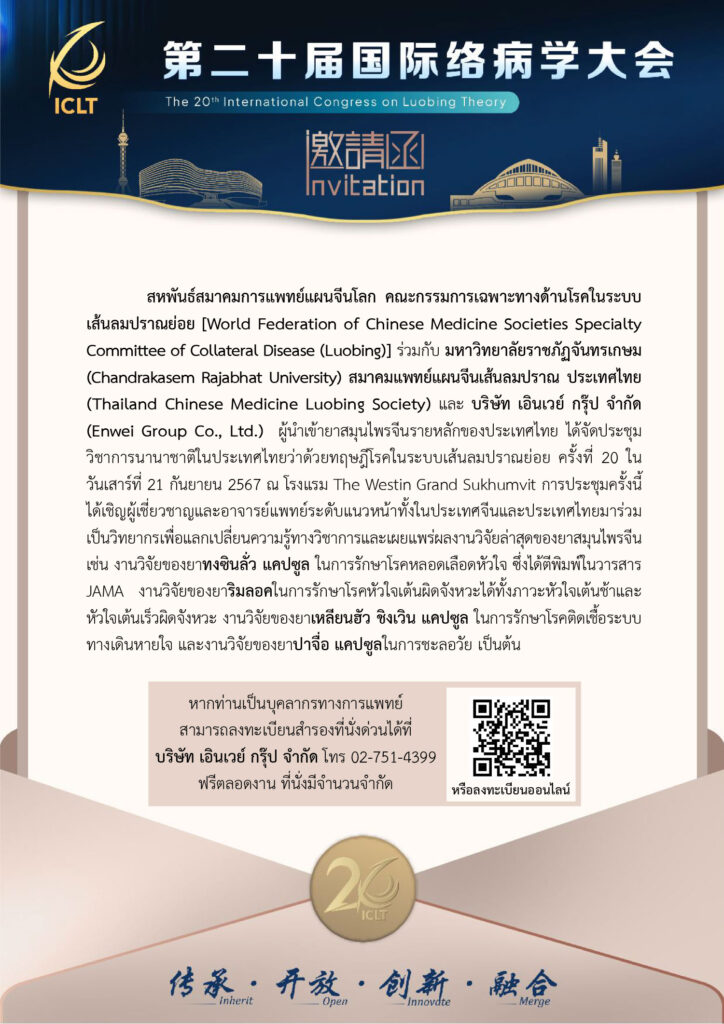 สหพันธ์สมาคมการแพทย์แผนจีนโลก คณะกรรมการเฉพาะทางด้านโรคในระบบเส้นลมปราณย่อย [World Federation of Chinese Medicine Societies Specialty Committee of Collateral Disease (Luobing)] ร่วมกับ มหาวิทยาลัยราชภัฏจันทรเกษม (Chandrakasem Rajabhat University) สมาคมแพทย์แผนจีนเส้นลมปราณ ประเทศไทย (Thailand Chinese Medicine Luobing Society) และ บริษัท เอินเวย์ กรุ๊ป จำกัด (Enwei Group Co., Ltd.) ผู้นำเข้ายาสมุนไพรจีนรายหลักของประเทศไทย ได้จัดประชุมวิชาการนานาชาติในประเทศไทยว่าด้วยทฤษฎีโรคในระบบเส้นลมปราณย่อย ครั้งที่ 20 ในวันเสาร์ที่ 21 กันยายน 2567 ณ โรงแรม The Westin Grand Sukhumvit การประชุมครั้งนี้ได้เชิญผู้เชี่ยวชาญและอาจารย์แพทย์ระดับแนวหน้าทั้งในประเทศจีนและประเทศไทยมาร่วมเป็นวิทยากรเพื่อแลกเปลี่ยนความรู้ทางวิชาการและเผยแพร่ผลงานวิจัยล่าสุดของยาสมุนไพรจีน เช่น งานวิจัยของยาทงซินลั่ว แคปซูล ในการรักษาโรคหลอดเลือดหัวใจ ซึ่งได้ตีพิมพ์ในวารสาร JAMA งานวิจัยของยาริมลอคในการรักษาโรคหัวใจเต้นผิดจังหวะได้ทั้งภาวะหัวใจเต้นช้าและหัวใจเต้นเร็วผิดจังหวะ งานวิจัยของยาเหลียนฮัว ชิงเวิน แคปซูล ในการรักษาโรคติดเชื้อระบบทางเดินหายใจ และงานวิจัยของยาปาจื่อ แคปซูลในการชะลอวัย เป็นต้น